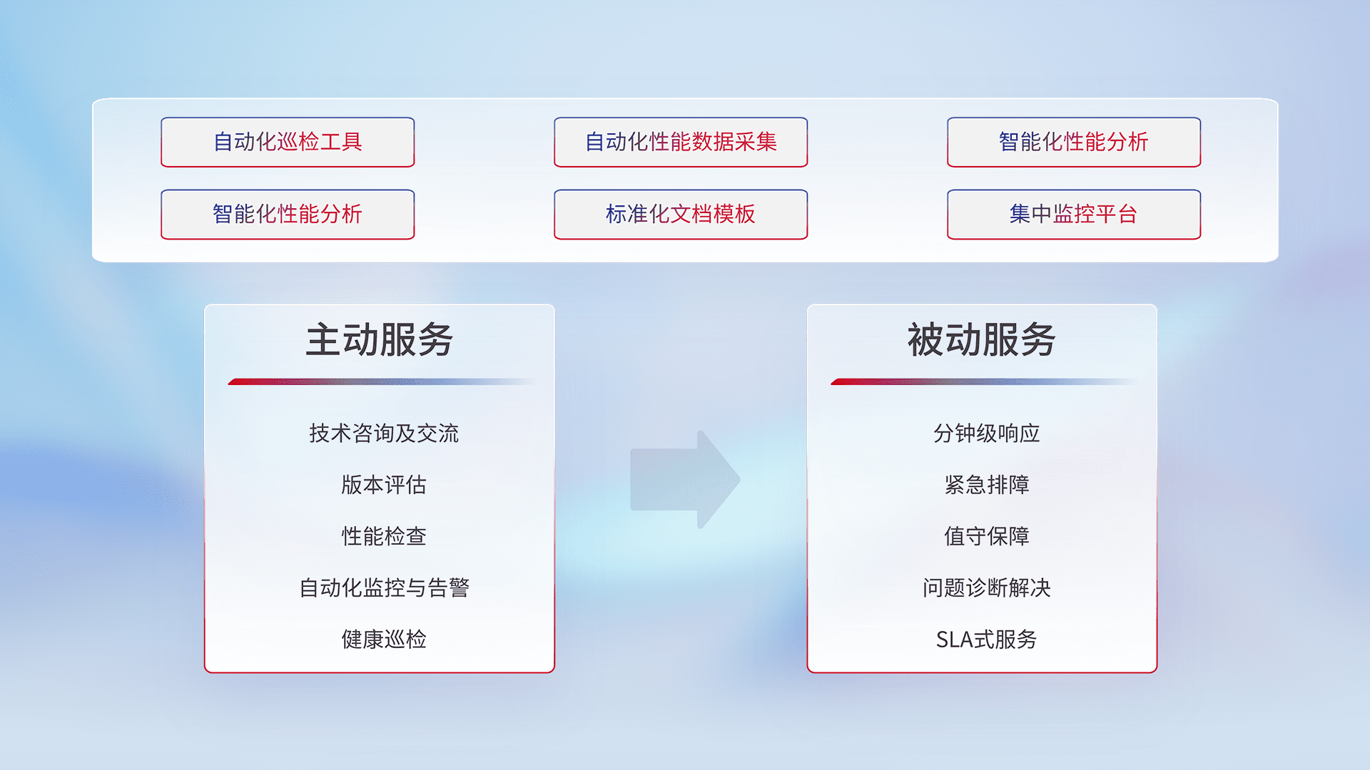 智能化工具和标准化文档,,,保障服务质量,,提供主动服务(包含技术咨询、、、版本评估、、、性能检查、、自动化监控与告警、、、、健康巡检)和被动服务包含(分钟级响应、、紧急排障、、值守保障、、、、问题诊断解决、、SLA服务)。。